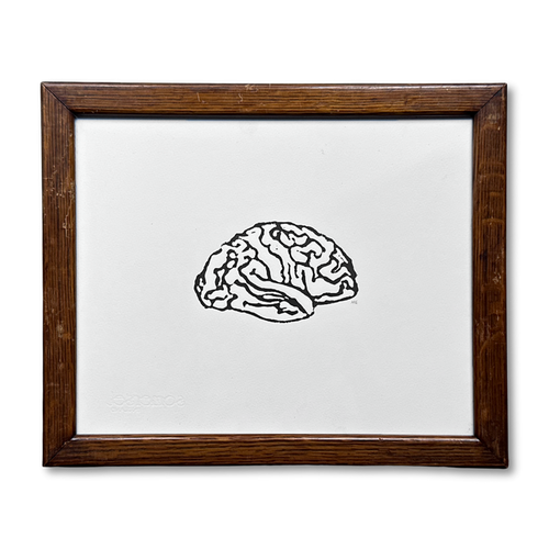 "Brain", Hugo Guinness' enchanting linocut, is intricately carved, printed by hand and housed within an antique wood frame, showcasing Guinness's mastery of linoleum prints, and bringing a unique charm to each signed piece.
