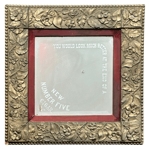 This 20.5" W x 20.5" H early 20th century Arts & Crafts mirror hails from John Derian's thoughtfully curated collection of vintage art & mirrors. The brass embossing adds a touch of elegance and detail to the mirror's frame, enhancing its aesthetic appeal while staying true to the movement's emphasis on handcrafted elements. This combination of artisanal skill and decorative refinement captures the essence of the Arts and Crafts style, making the mirror a timeless piece of functional art. Mirror includes text overlay: "You would look much better at the end of a New Number Five Cigar"