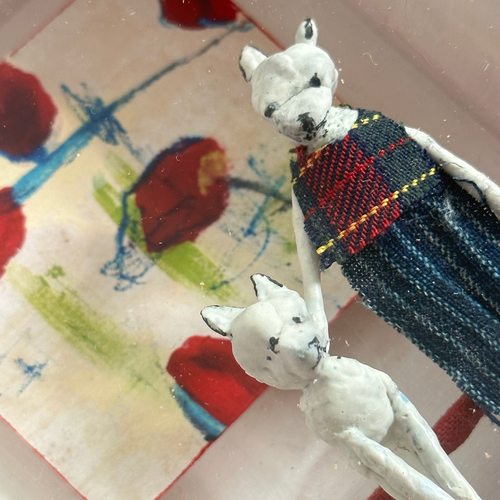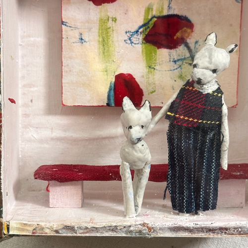 • Virginia McCracken, captivated by the intricacy, mystery, and charm inherent in small objects in nature and human-made images, draws inspiration from a childhood steeped in make-believe; her artistic endeavors involve painting small still life pieces and crafting assemblage/dioramas featuring papier mache figures, often blending both mediums to create imaginative worlds.