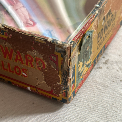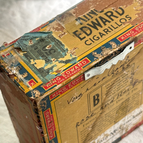 Fashioned out of papier-mâché, found objects, fabrics, and delicately placed inside an old cigar box, "Rose and Her Puppy" Assemblage is an original assemblage by Virginia McCracken. Each piece, and its corresponding title, tells a story through its intricate detail and sense of whimsy. See all of Virginia's work here.