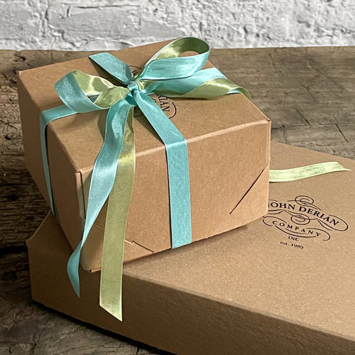 Depending on the size of the desired item, gift boxed products come wrapped in our signature script tissue and placed in a classic embossed brown box tied with colorful ribbons. If an item is too large for a box, it will be wrapped in script tissue with ribbon. Unfortunately, we are unable to accommodate specific ribbon requests as colors may vary.
