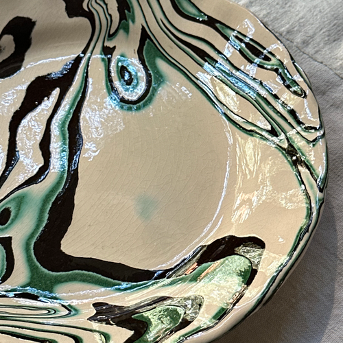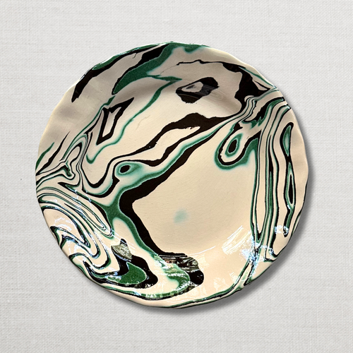 This hand crafted dessert plate by Sylvie Saint-Andre Perrin is expertly made with intricate swirls in hues of white, dark green and black with a scalloped edge. Employing plaster molds and a meticulous stamping process resulting in one-of-a-kind pieces, Sylvie imparts a touch of artistic color that's essential for any captivating dinner table. See our full collection of Atelier Saint Andre Perrin plates, goblets, and platters here.