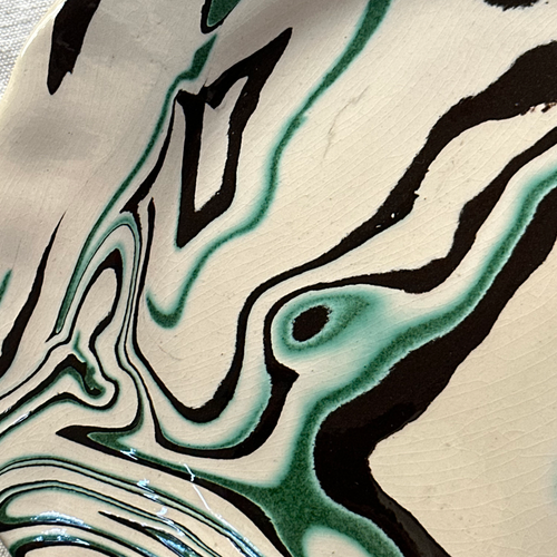Sylvie Saint-Andre Perrin achieves the marble effect of her line of ceramics by a process called stamping. Each color of clay is created by mixing in various oxides that are then swirled and shaped using plaster molds.