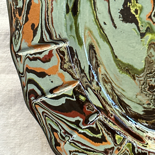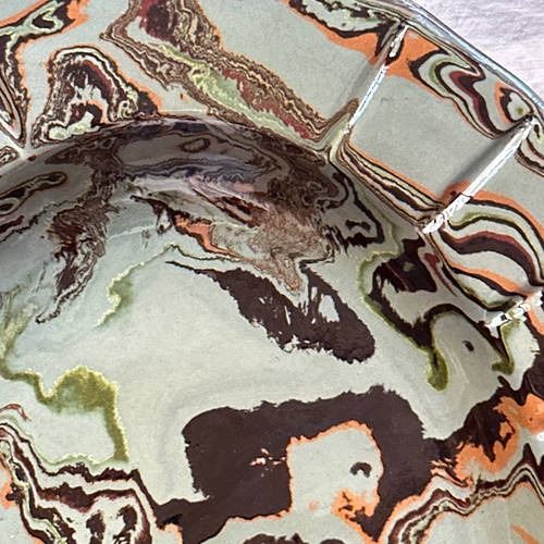Sylvie Saint-Andre Perrin achieves the marble effect of her line of ceramics by a process called stamping. Each color of clay is created by mixing in various oxides that are then swirled and shaped using plaster molds.