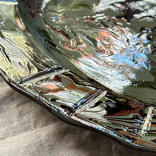 This hand crafted dinner plate by Sylvie Saint-Andre Perrin is expertly made with intricate swirls in hues of light green, red, dark green, black and yellow ochre. Employing plaster molds and a meticulous stamping process resulting in one-of-a-kind pieces, Sylvie imparts a touch of artistic color that's essential for any captivating dinner table. See our full collection of Atelier Saint Andre Perrin plates, goblets, and platters here.
