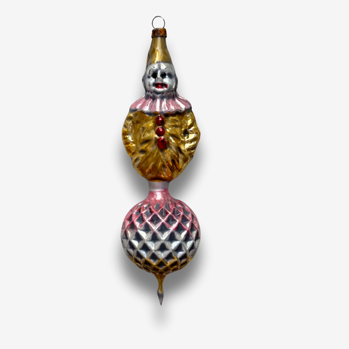 This clown ornament is a nostalgic addition to your holiday decor. Meticulously crafted, the bauble features a circus clown atop a textured ball in muted pink and yellow colors.