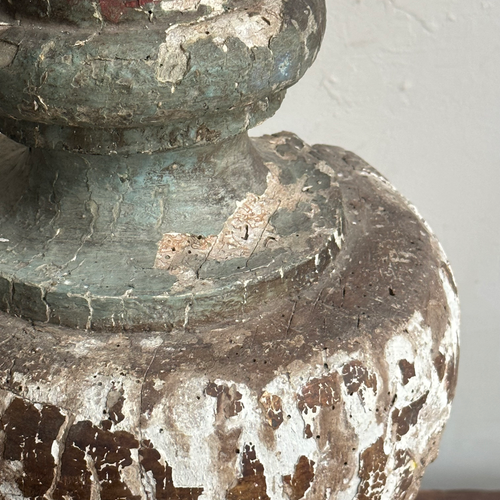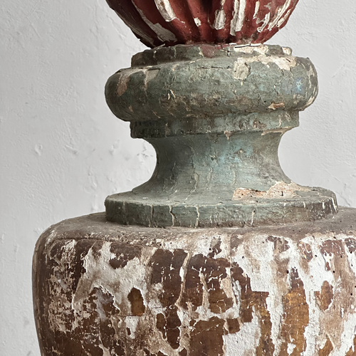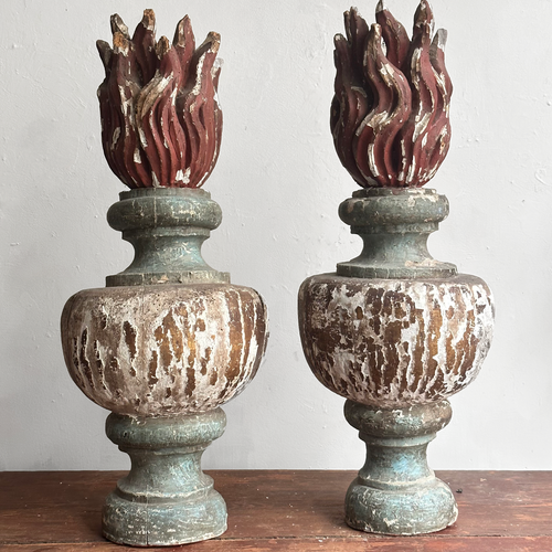 This pair of French architectural elements from the 1800s is among John Derian's trove of handpicked vintage & antique goods. Carefully carved and painted wood, the pair features a flame motif (a symbol of passion and enlightenment) and were commonly used in 19th-century France to crown buildings and add dramatic, decorative flair.