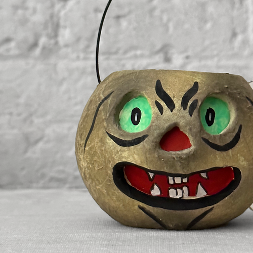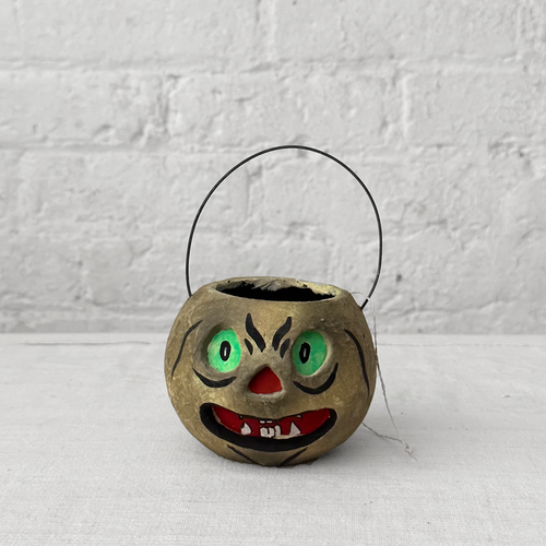 Introducing our charming Small Halloween Lantern Candy Bucket in Grey with Green Eyes inspired by vintage Halloween decor and crafted from painted papier-mâché. These enchanting pieces capture the nostalgia of Halloweens past. Use them as decorative accents or fill them with candy for a delightful treat.