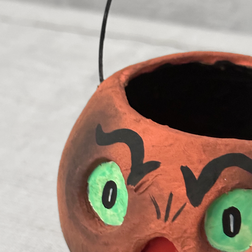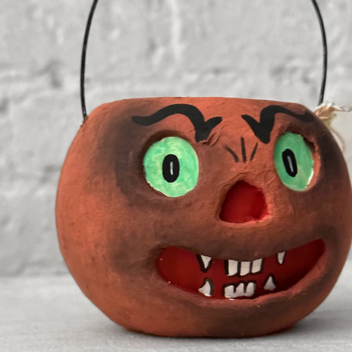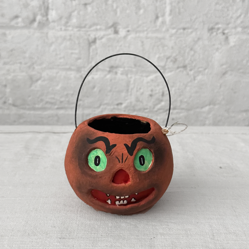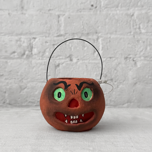 Introducing our charming Small Halloween Lantern Candy Bucket in Orange with Green Eyes inspired by vintage Halloween decor and crafted from painted papier-mâché. These enchanting pieces capture the nostalgia of Halloweens past. Use them as decorative accents or fill them with candy for a delightful treat.